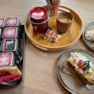 We bestelden ons vaste recept; koffie, thee en appeltaart met slagroom. De thee werd gepresenteerd op een leuk blaadje met trommeltjes losse thee en een aantal theezakjes. Hoewel er heerlijk geurende losse thee bij zat koos Irmy toch voor een zakje. Lekker. De koffie van Annemieke was ook erg lekker. Vers gezet…??? Beide gepresenteerd in mooie mokken.