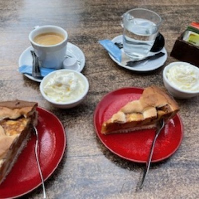 We kwamen natuurlijk voor de appeltaart met slagroom. De appeltaart werd gebracht op een rood schoteltje, met de slagroom apart geserveerd in een wit kommetje. De slagroom was echt en ongezoet, erg lekker. Had misschien iets meer mogen zijn want de taart was eerder op dan de slagroom.